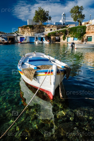 Рыбацкий свинья, пришвартованный в кристально чистой бирюзовой морской воде в гавани греческой рыбацкой деревни Мандракия на острове Милос (Греция)
