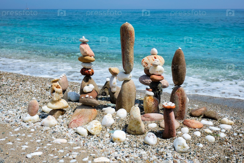 Концепция дзен-баланса - это расслабление мира и гармонии.Каменные камни стоят на берегу пляжа голубого моря в природе.Медитативное искусство кладки камней