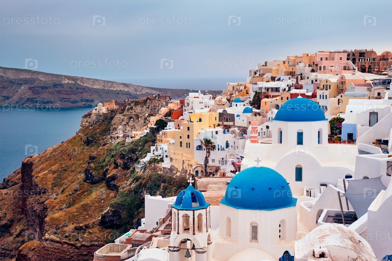 Знаменитый греческий культовый селфи туристическое направление Деревня Оя с традиционными белыми домами и церковью на острове Санторини при закате солнца в сумерках