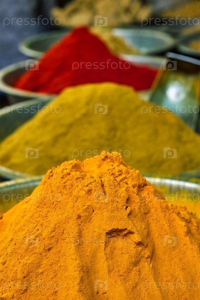 Порошок куркумы и чили на рынке пряностей в Индии.Рынок Сардар, Джодхпур, Раджастхан, Индия