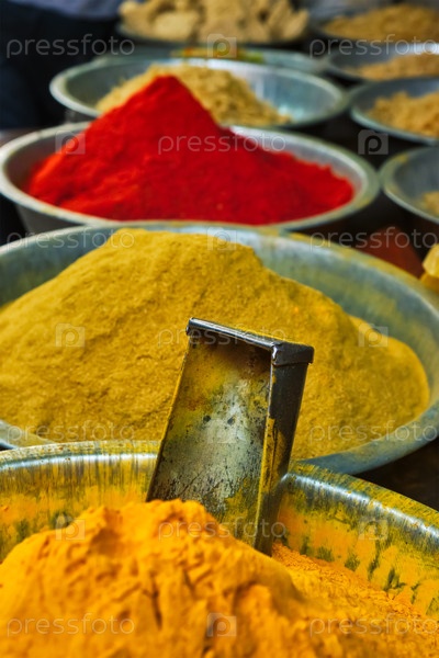 Порошок куркумы и чили на рынке пряностей в Индии.Рынок Сардар, Джодхпур, Раджастхан, Индия