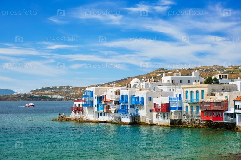 Маленькая Венеция в Хоре Миконос с яхтой и круизным судном.Остров Миконос, Греция