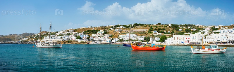 Панорама греческих рыбацких лодок в чистой морской воде в порту Миконоса