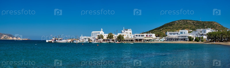 Панорама пляжа и рыбацкой деревни Польлония с рыболовными лодками в море Город Поллония, остров Милос, Греция. Pan Horizontal Camera