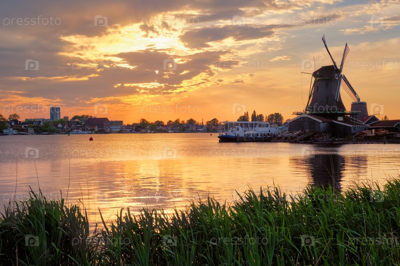 Ветряные мельницы на знаменитом туристическом объекте Заансе-Шанс в Голландии при закате солнца с драматическим небом