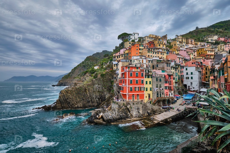 Деревня Риомаджоре - популярное туристическое направление в Национальном парке Цинк-Терре, объекте Всемирного наследия ЮНЕСКО, Лигурия, Италия в бурную погоду