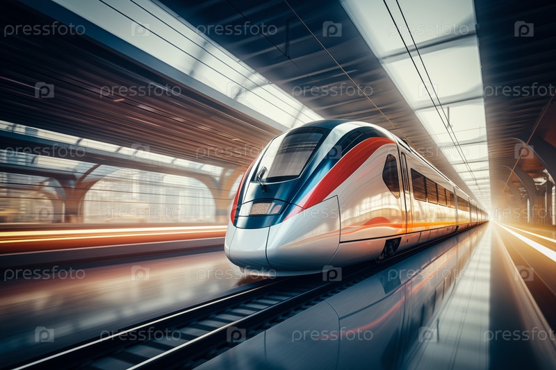 Современный высокоскоростной поезд на футуристической станции.Современные транспортные технологии, скорость, концепции путешествий.Железная дорога с эффектом размытия движения