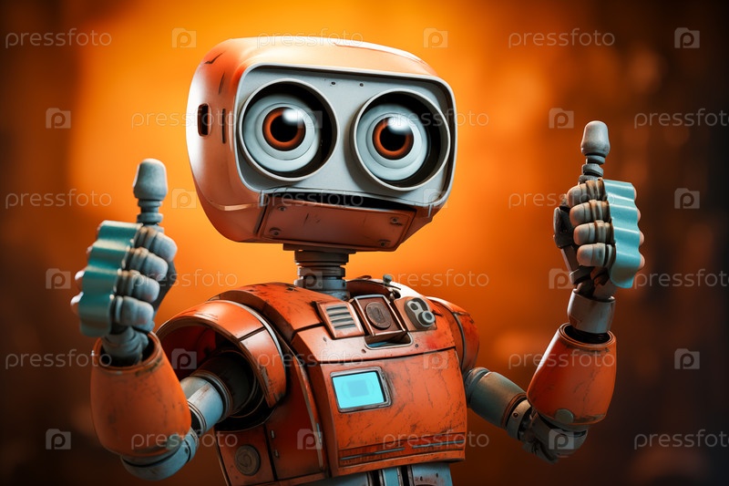 Оранжевый робот поднимает большой палец. Дружеский робот имеет большие круглые глаза и дружелюбную улыбку. Концепция одобрения технологии искусственного интеллекта, успеха, дружбы