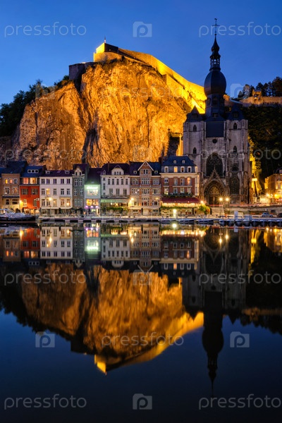 Ночные виды на город Динан, университетскую церковь Нотр-Дам де Динан над рекой Мауза и мост Шарля де Голля и Цитадель Динан освещаются вечером