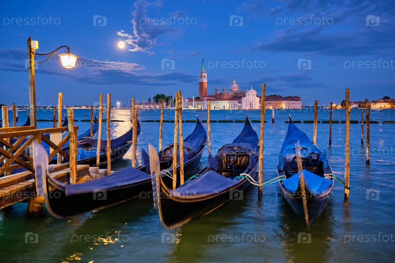 Туристическим фоном Венеции являются гондолы на площади Святого Марка (Сан-Марко) и церковь базилики San Giorgio Maggiore, которую можно увидеть через венецианскую лагуну при полнолунии