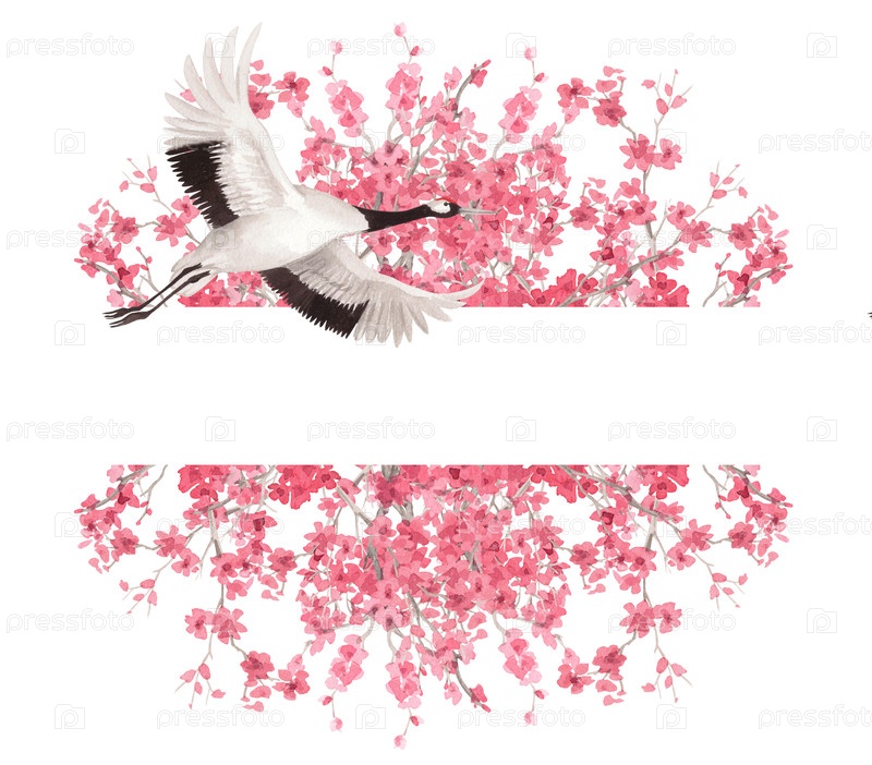 Баннер из вишневой ветви и японский кран. Иллюстрация акварели ручной работы. Для ткани, обоев, поздравительных открыток, дизайна, декора и иллюстрации