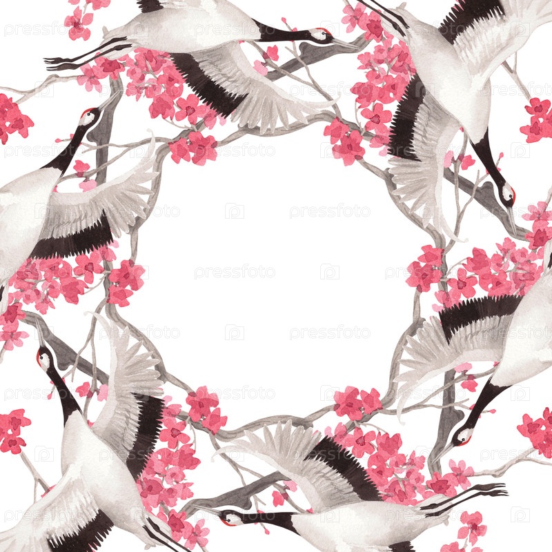 Квадратная рама летающих японских кранов и вишневых деревьев. Иллюстрация ручной акварели. Для ткани, обоев, поздравительных открыток, дизайна, декора и иллюстрации