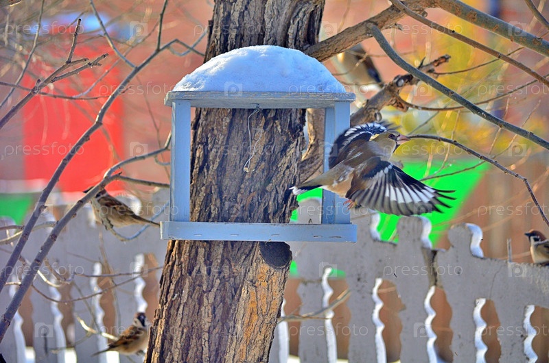 Воробьи и дубоно на кормушке в дереве