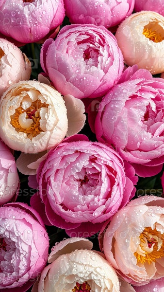 Нежные пионы розового и кремового цвета в капле росы, сложенные в букет