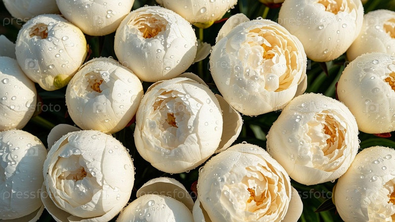 Кремовые пионы в капле росы, фоновое изображение цветов