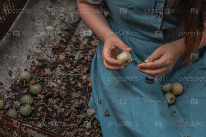держит яблоко