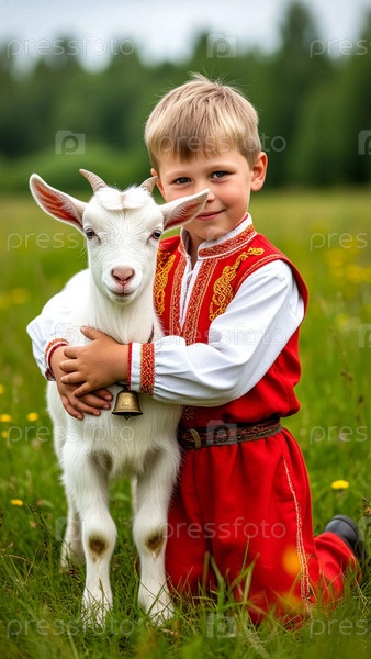 Мальчик в народной одежде обнимает маленькую белую козу