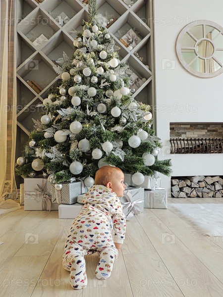 Маленький ребенок ползет к подаркам и элегантной праздничной елке
