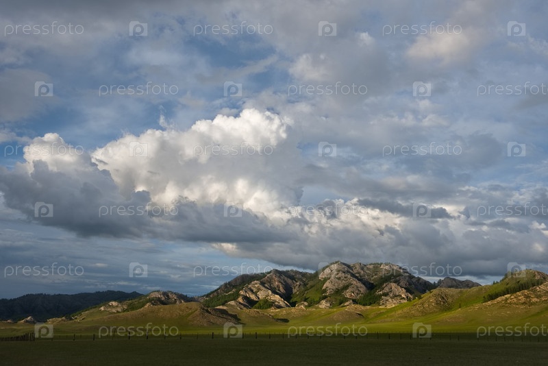 Живописное вечернее небо над бесконечными пастбищными холмами возле деревни Усть-Кан