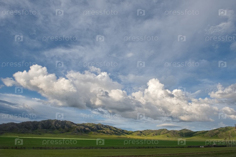Живописное вечернее небо над бесконечными пастбищными холмами возле деревни Усть-Кан