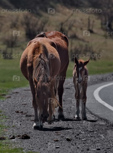 Южная часть Западной Сибири, Алтайские горы. кобыла с жеребцом на свободных пастбищах в горных долинах реки Урсул