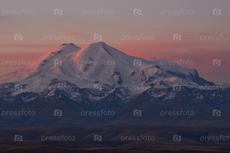 Потрясающий восход солнца на скалах Большого плато Бермамит на фоне горы Эльбрус