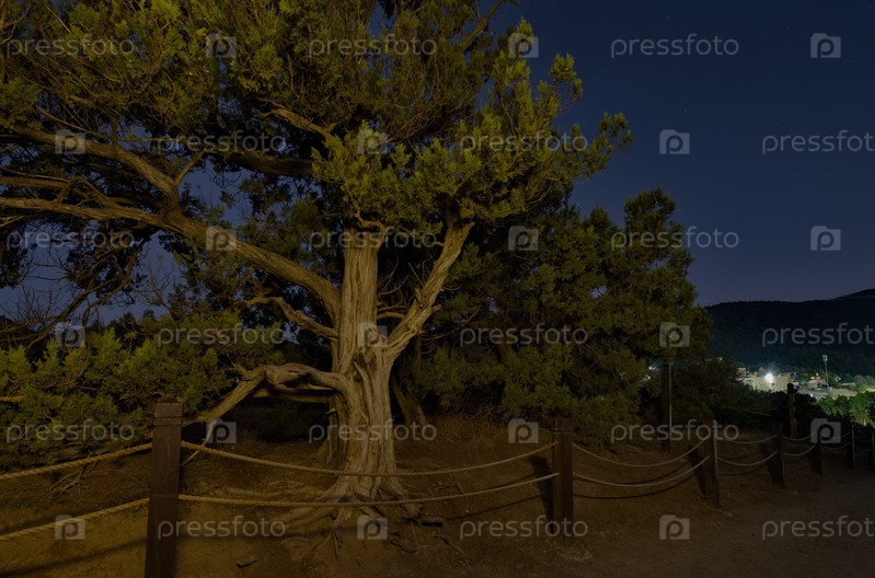 Странные кривые реликтных березовых деревьев на ночных скалах Черного моря недалеко от мыса Капчик на Крымском полуострове