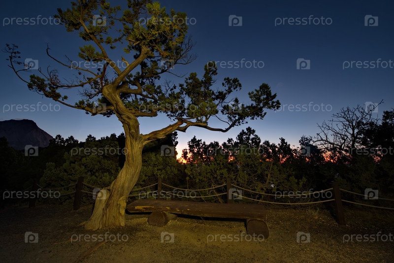Странные кривые реликтных березовых деревьев на ночных скалах Черного моря недалеко от мыса Капчик на Крымском полуострове