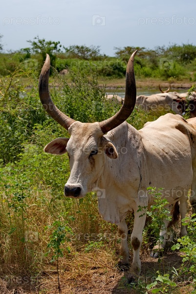 Портрет священной коровы Зебу с большими острыми рогами на водоеме возле небольшого озера