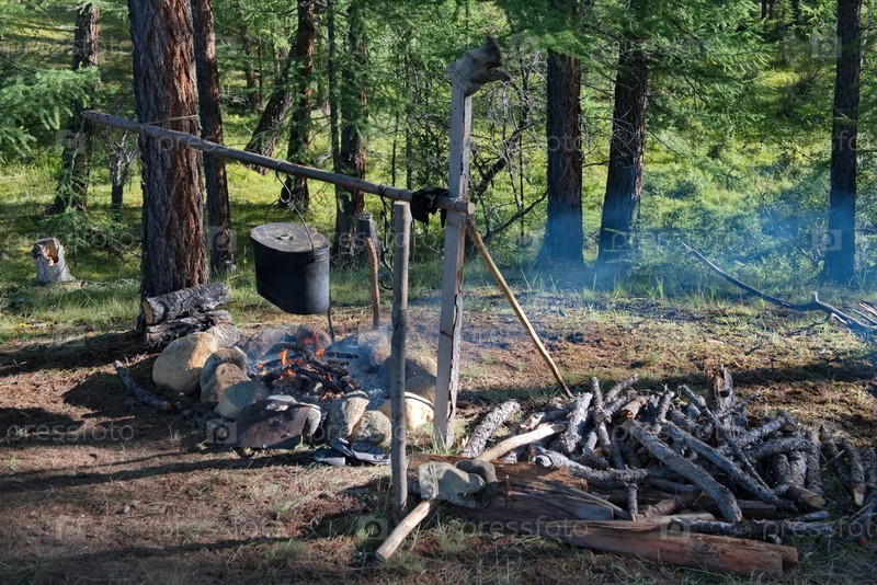 Огонь на обед с кастрюлей кипящего уша и чаем в туристическом лагере на берегу горной реки Тисса