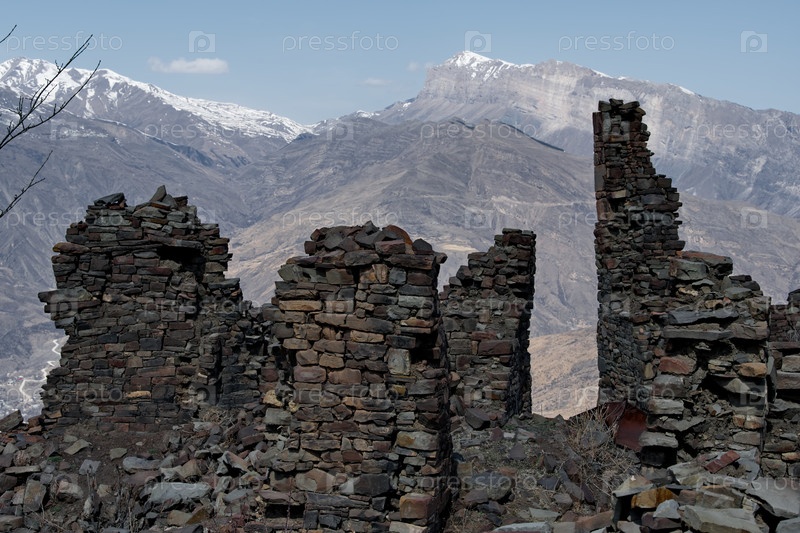 Россия. Северо-восток Кавказа, Дагестан. Вид на Кавказские горы через открытие заброшенного дома в горной деревне Хуштада. Традиционно все дома построены из камня