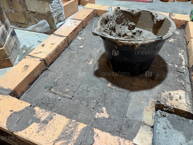 Кирпич с древесной плиты Первый ряд кирпичей заложен Строительство отопительной печи Ведро со смесью из печи