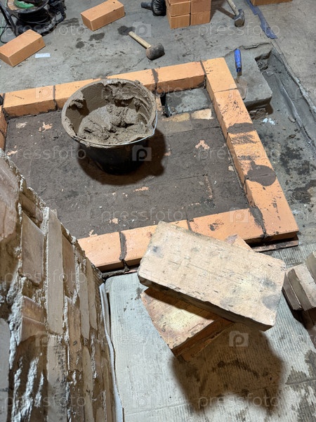 Кирпич из древесной плиты Первый ряд кирпичей заложен Строительство нагревательной печи Кувшин с смесью духов и инструментов