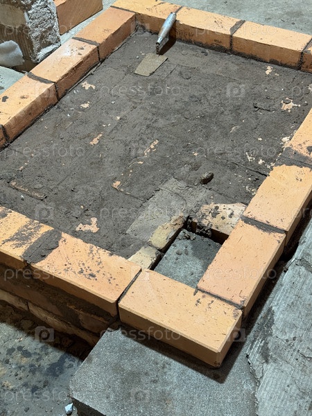 Кирпич из древесной плиты Первый ряд кирпичей заложен Строительство отопительной печи Видимый холст строителей