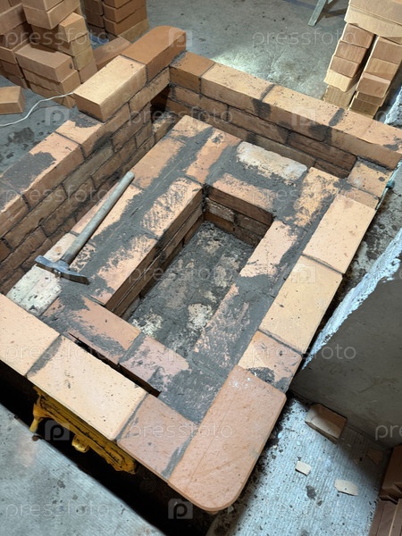 Кирпичная кладка древесной плиты Строительство отопительной печи Установлена пепельная установка Формированное ядро печи