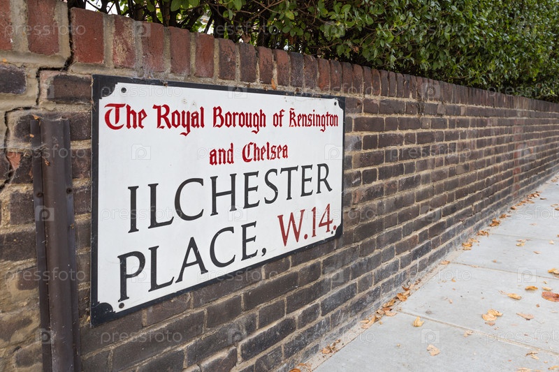 Уличный знак Ilchester Place W14 установлен на кирпичной стене в королевском районе Кенсингтон и Челси, Лондон, Великобритания