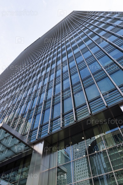 Низкоугольный вид современной стеклянной офисной башни, отражающей небо