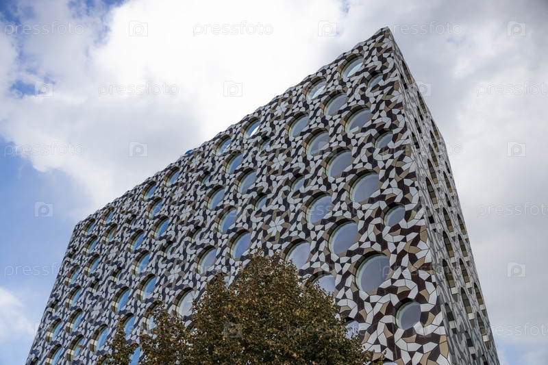 Низкоугольный вид современного здания с геометрическим фасадом и перфорированной металлической облицовкой, показывающей повторяющиеся узоры против облачного неба