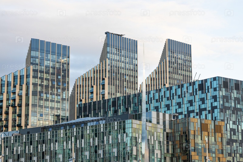 Впечатляющий вид на современную городскую архитектуру с несколькими современными зданиями с уникальными стеклянными фасадами и геометрическими узорами