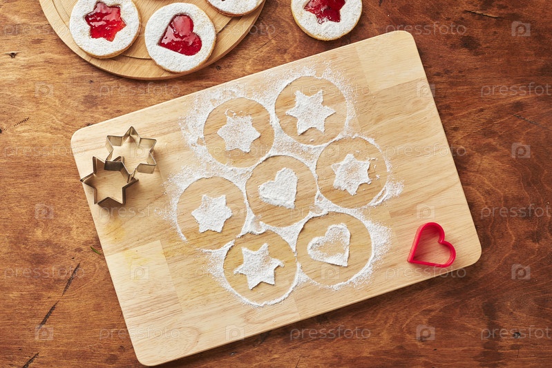 Доска для резки древесины с сахаром в порошке и печеньем Linzer, процессом выпечки