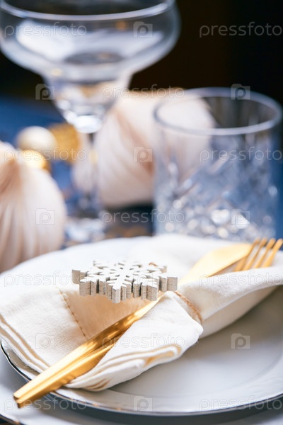 Рождественский праздничный стол с белыми тарелками и золотыми столовыми приборами, подарками из белой и золотистой бумаги, ювелирными украшениями и шарами