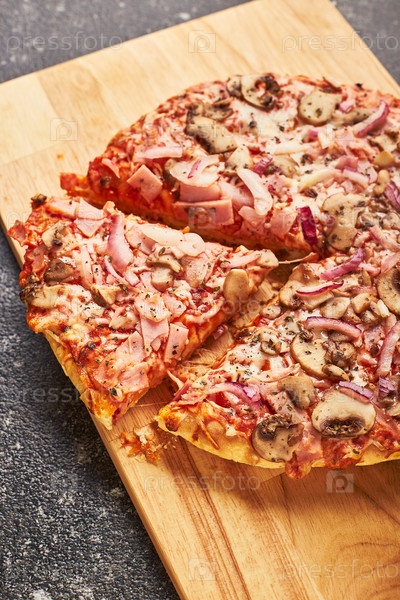 Быстрая еда, замороженная пицца с ветчиной в духовке, грибы и сыр на густом тесте