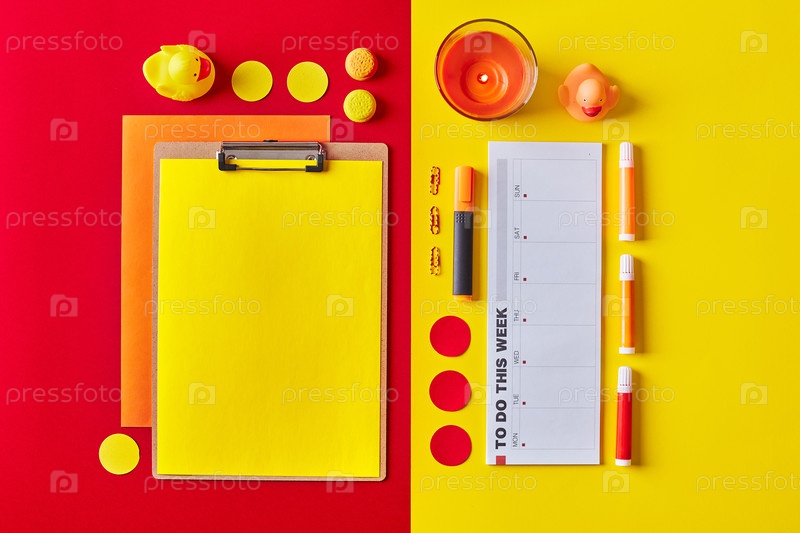 Бумага на буклете для обмена макетами с помощью планировщика, свечи, канцелярские принадлежности в красных и желтых тонах