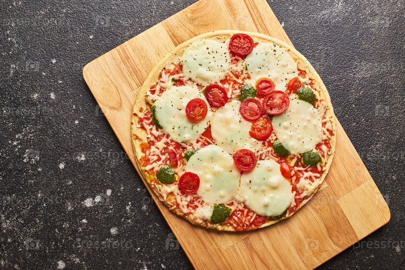 фаст-фуд печена замороженная пицца с сыром, помидорами и песто. готова к еде. flatlay - место для текстовых сообщений