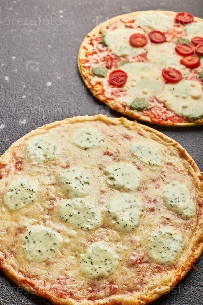 Быстрая еда, замороженная пицца Четыре сыра и пицца с сыром моцареллой, помидорами и песто