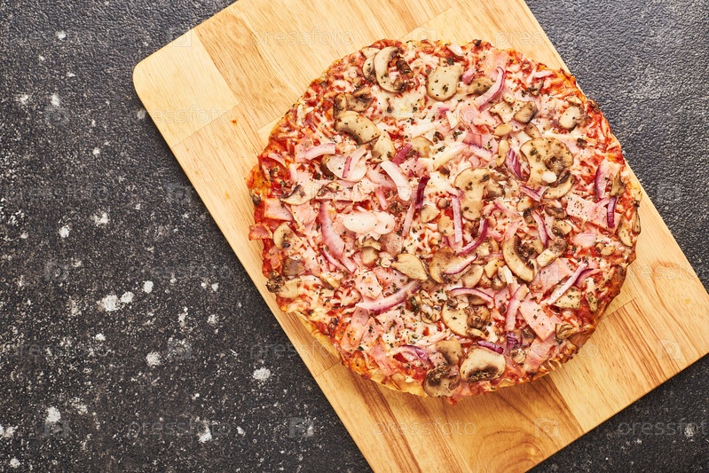 Быстрая еда, замороженная пицца с ветчиной в духовке, грибы и сыр на густом тесте