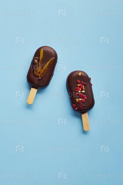 Моссовый десерт с фруктовыми ароматами в виде мороженого из макарон, покрытого темным шоколадом на синем фоне