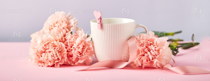 Концепция дизайна праздничного приветствия с букетом гвоздик на розовом и синем фоне