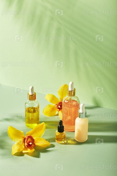 Продукты косметического ухода в стеклянных бутылках с цветами орхидеи - сыворотка, крем, гель, масло. Концепция по уходу за лицом и телом, спа-центр, тропическая релаксация. Косметика на цветном фоне с твёрдыми тенями