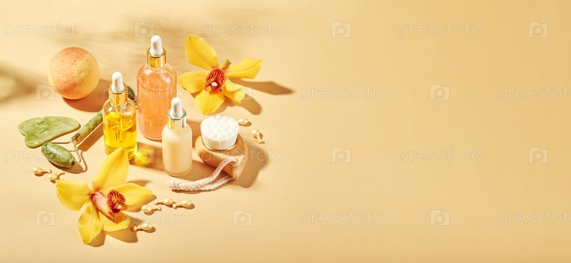 Продукты косметического ухода в стеклянных бутылках с цветами орхидеи - сыворотка, крем, гель, масло. Концепция по уходу за лицом и телом, спа-центр, тропическая релаксация. Косметика на цветном фоне с твёрдыми тенями
